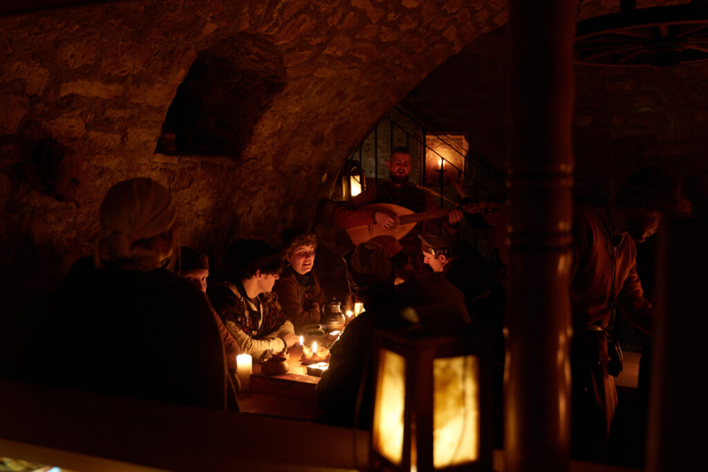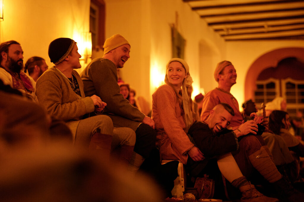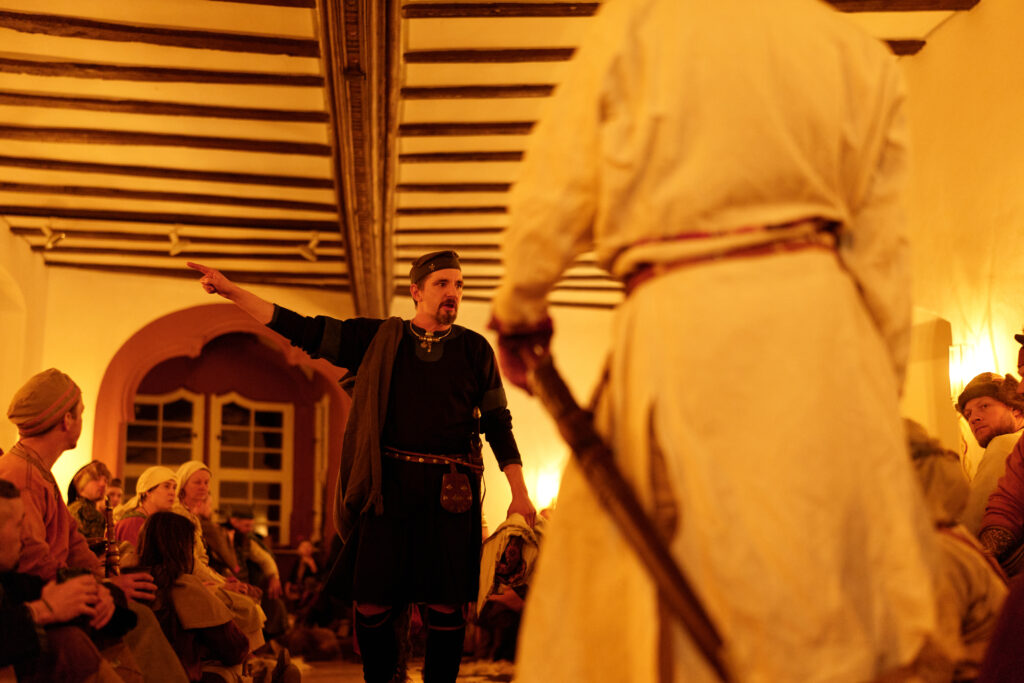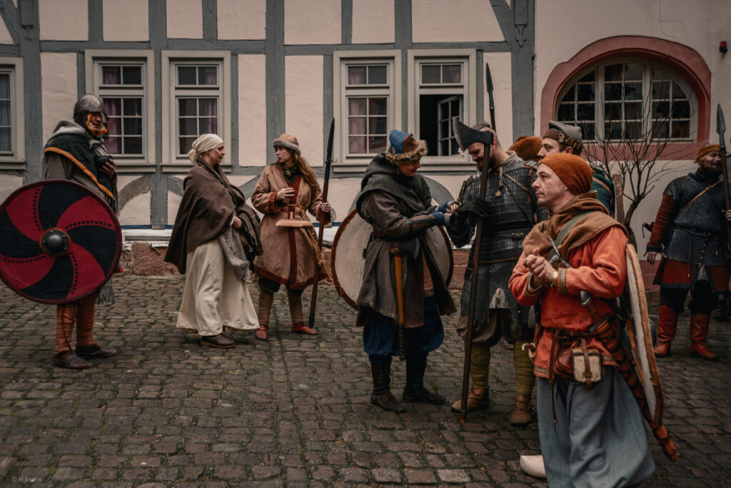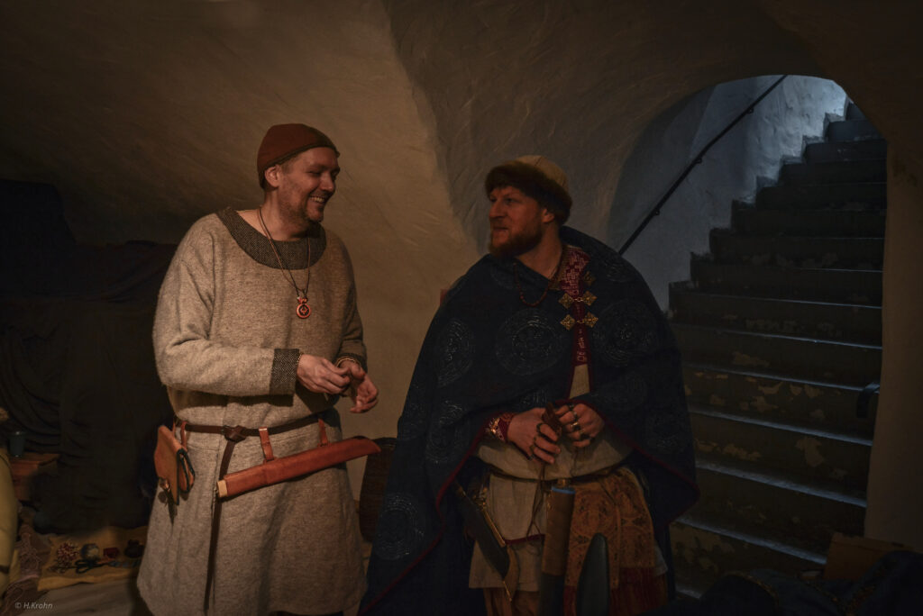 Am Tor der Fjoreburg blieb die Sippe kurz stehen und sprach mit der Wache. Es seien schon sehr viele Sippen angekommen und säßen schon drinnen und ließen es sich als Gäste des Heerkönigs bei Bier, Gesang und gebratenem Fleisch gut gehen, erfuhren sie. Sie konnten auch bereits am Tor deutlich die launigen Sänger vernehmen. Wer wollte, fuhr die Wache fort, der könnte einen neuen Trank kosten, den ein Raubzug in den Süden gerade mitgebracht hatte: Gewürz“tee“. Neben vielen Nordleuten seien auch mehr Fremde auf diesem Thing – Rus aus dem Osten, ein paar Franken und beunruhigend viele Angelsachsen. Und die Botschafter ganz eigenartiger fremder Länder seien schon da: manche hätten beeindruckende Brünnen aus durchgängigem blitzendem Stahl, und andere sahen noch nicht einmal mehr wie Menschen aus. Die Wache gab ihnen den Rat, möglichst sofort den Heerkönig aufzusuchen – zum einen damit er ihnen das Gastrecht aussprach, das sie vor allen Angriffen beschützen würde, aber zum anderen auch um sich die besten Plätze in der Thinghalle zu sichern.